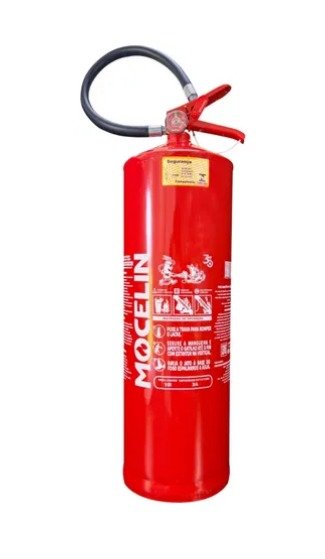 O extintor possui carga de 10 litros de água potável, capaz de combater fogos da classe A  (madeira, papel, tecido, materiais sólidos em geral).